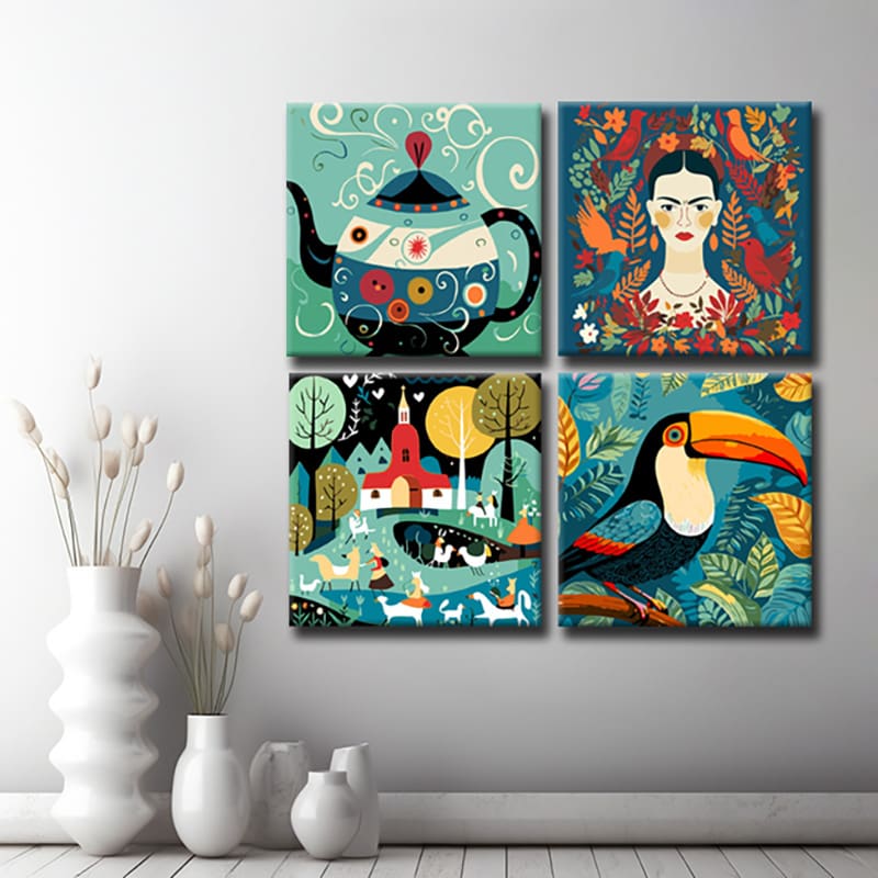 Folk Art auf Bilderwand Stilvolle und Traditionelle LeinwandBilder für Ihre Wanddekoration, 4-teilig