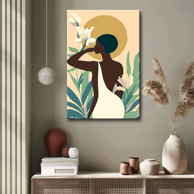 Malen nach Zahlen Kunst Minimalismus Schwarze Frau Weißes Kleid