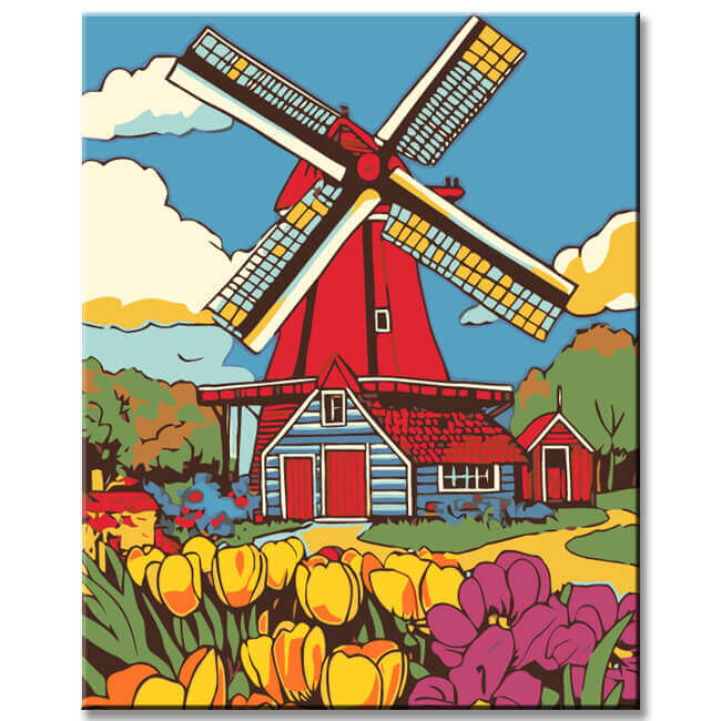 Malen nach Zahlen Niederlande Holland Windmühle Blumen