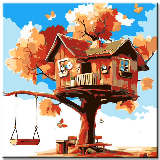 Malen nach Zahlen Kunst Illustration großes braunes Baumhaus mit Schaukel