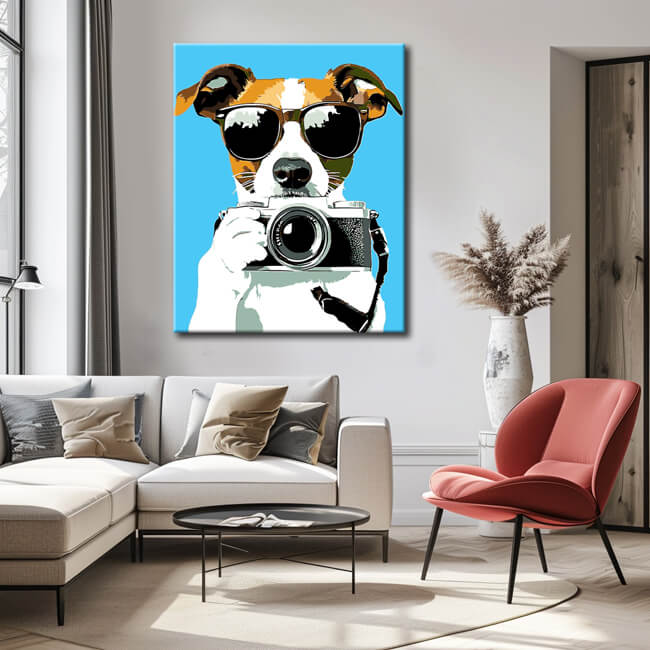 Malen nach Zahlen Kunst Hund mit Brille und Kamera
