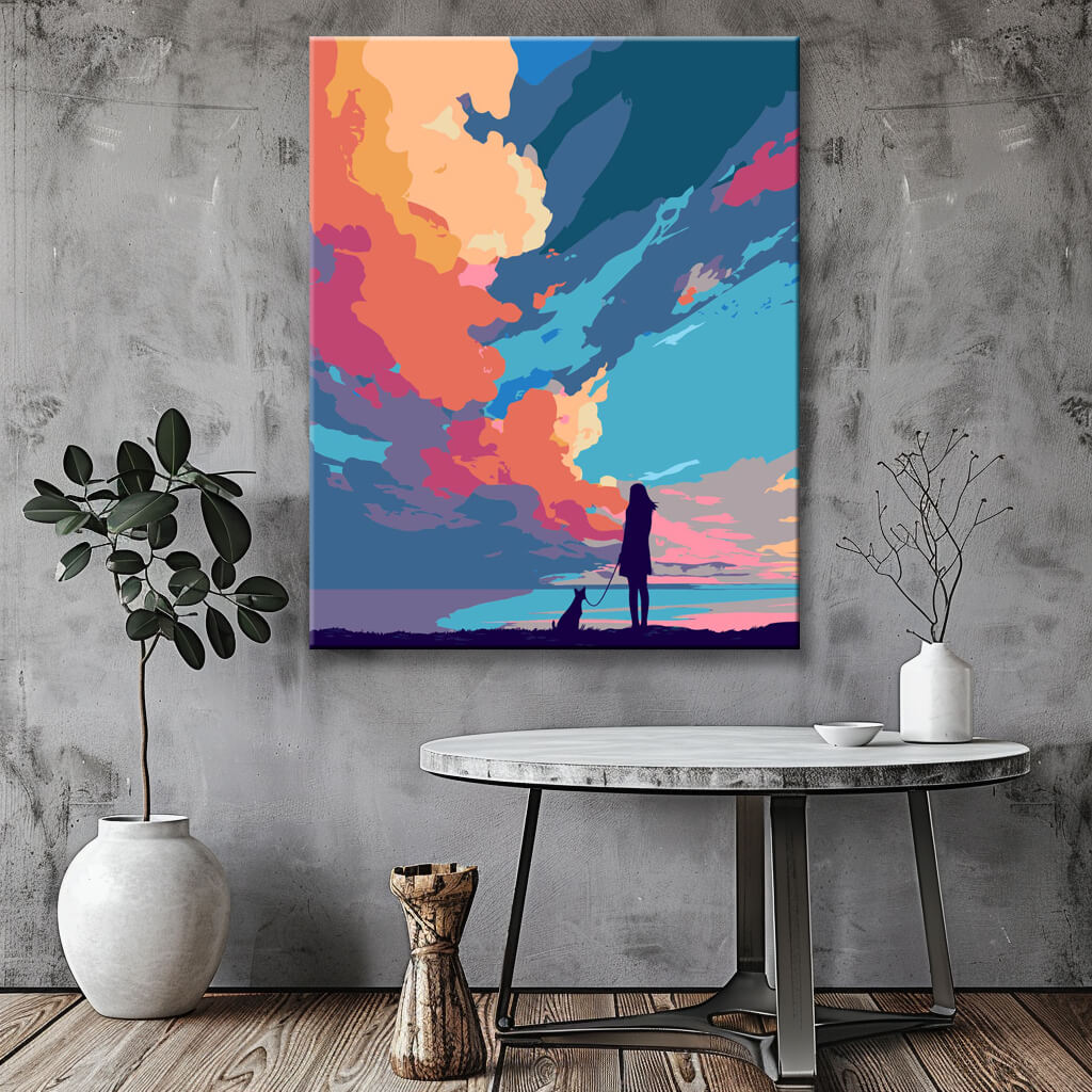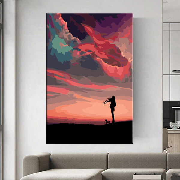 Malen nach Zahlen Kunst Natur Mädchen mit Hund und exotischen Wolken