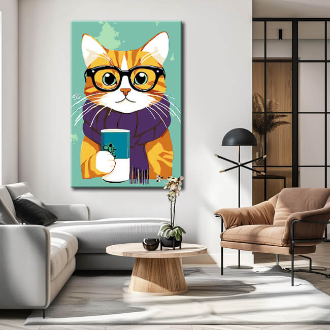Malen nach Zahlen Kunst Tier Katze mit Lila Schal und Brille